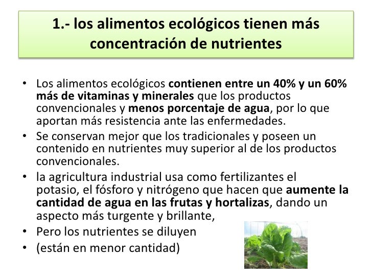 Los alimentos ecológicos proporcionan además un aporte nutricional más completo que los convencionales y sus efectos en el organismo siempre serán positivos. Los alimentos ecológicos contienen entre un 40% y un 60% más de vitaminas y minerales que los productos convencionales y menos porcentaje de agua, por lo que aportan más resistencia ante las enfermedades. Se conservan mejor que los tradicionales y poseen un contenido en nutrientes muy superior al de los productos convencionales.
